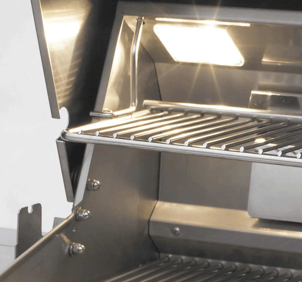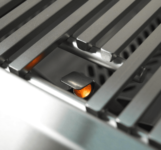 Flash tubes serve as a backup. Flavor grids sit above the burners to spread heat evenly and protect the burners from debris and grease. In the rear of the grill is a 13,000 BTU stainless steel infrared backburner for the included heavy-duty rotisserie kit. For nighttime grilling, the interior of the gas side of the grill is lit by two halogen lights.