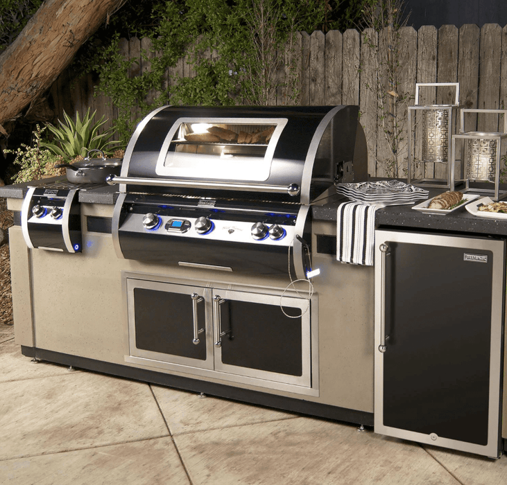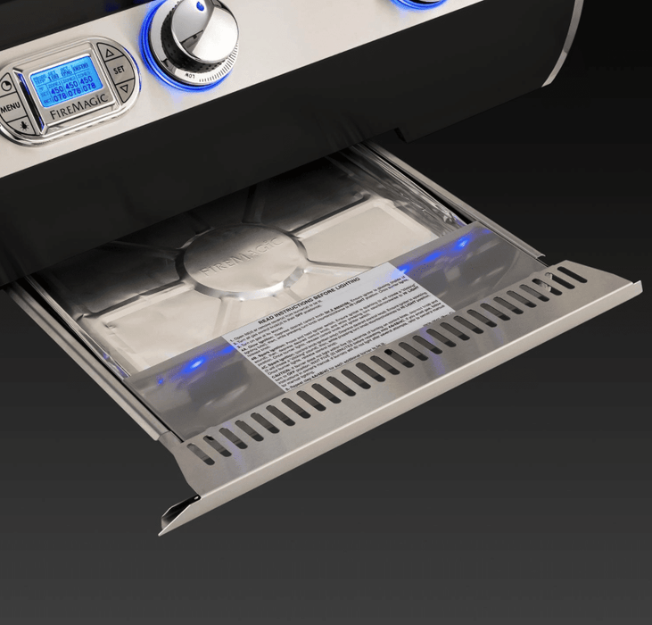 A new, larger drip tray with ball bearing glides makes cleanup with the disposable drip pan system even easier than before. Solid, raised hangers line the sides and back of the grill for a seamless look when placed into a countertop or island. A 120 VAC power source is required for ignition, as well as for the lighting functions. With all of these premium features and a beautiful black porcelain-coated facade, the Echelon Black Diamond series from Fire Magic defines luxury grilling.