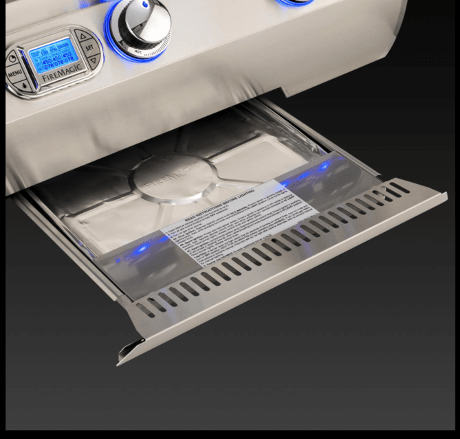 A new, larger drip tray with ball bearing glides makes cleanup with the disposable drip pan system even easier than before. Solid, raised hangers line the sides and back of the grill for a seamless look when placed into a countertop or island. A 120 VAC power source is required for ignition, as well as for the lighting functions. With all of these premium features, the Echelon Diamond series from Fire Magic defines luxury grilling.