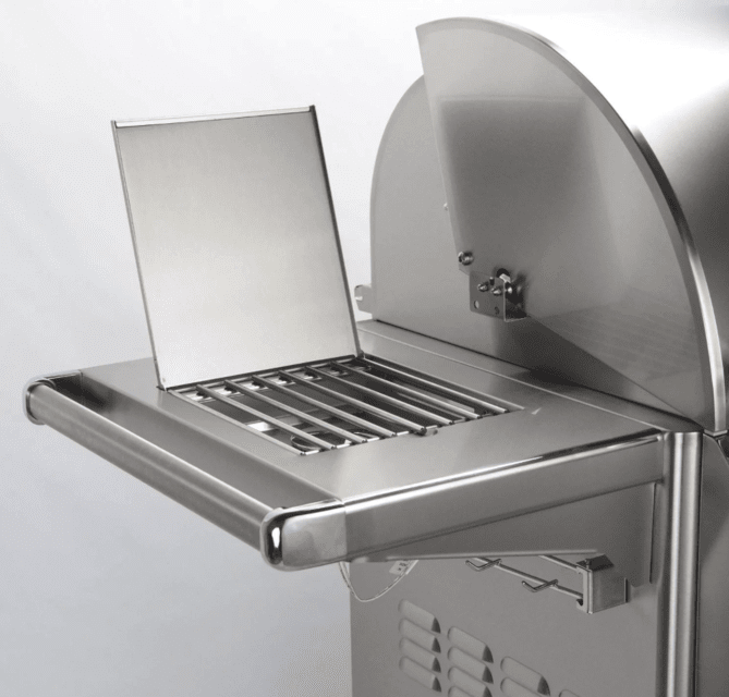 Additionally, Echelon Diamond grills come with a charcoal/smoker basket for adding a delicious, smoky flavor to your cook. For nighttime grilling, the interior of the grill is lit by two halogen lights. A new, larger drip tray with ball bearing glides makes cleanup with the disposable drip pan system even easier than before. The grill comes on a stainless steel cart which includes two storage drawers, a slide-out propane tank holder, and two side shelves. One of these shelves folds down while the other contains a flush-mounted 15,000 BTU side burner for extra cooking versatility. Locking casters keep the cart in place.
