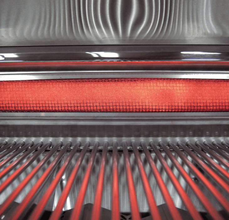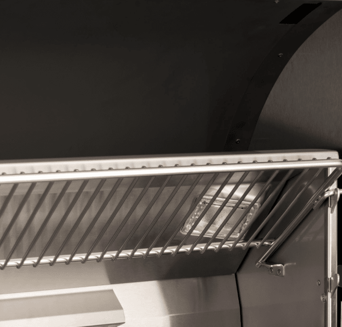The warming rack above can be adjusted and moved out of the way when not in use. In the rear of the grill is a Quantum stainless steel infrared backburner for the included heavy-duty rotisserie kit that produces 11,000 BTUs of radiant heat. This burner uses stainless steel foam, which provides double the heat per BTU.