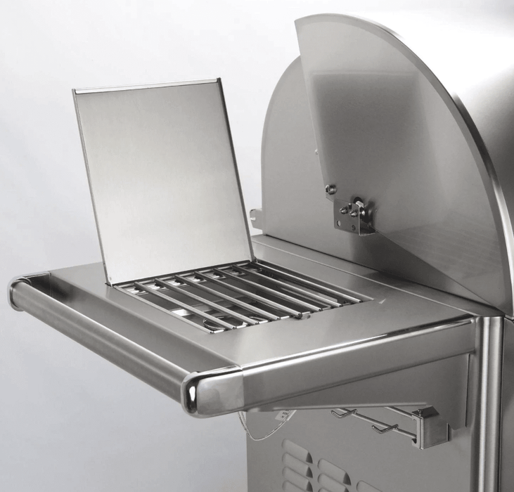 Additionally, Echelon Diamond grills come with a charcoal/smoker basket for adding a delicious, smoky flavor to your cook. For nighttime grilling, the interior of the grill is lit by two halogen lights. A new, larger drip tray with ball bearing glides makes cleanup with the disposable drip pan system even easier than before. The grill comes on a stainless steel cart which includes two storage drawers, a slide-out propane tank holder, and two side shelves. One of these shelves folds down while the other contains a flush-mounted 15,000 BTU side burner for extra cooking versatility. Locking casters keep the cart in place.