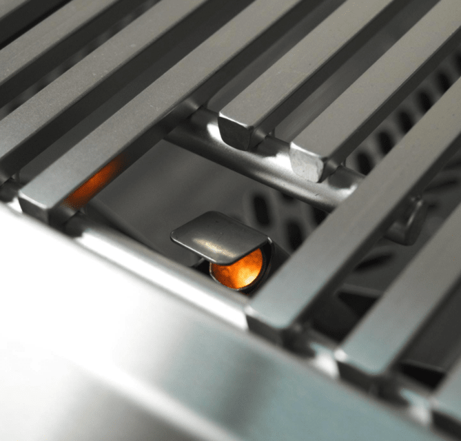 Flash tubes serve as a backup. Flavor grids sit above the burners to spread heat evenly and protect the burners from debris and grease. These flavor grids have attached heat zone separators, allowing you to create independent heat zones at the surface of the grill for varied cooking options. The 660 sq. in. cooking surface consists of the patented Diamond Sear cooking grids. These grids feature a matte, non-stick surface, and a trapezoidal shape that optimally transfers heat from the burner to the wide surface of the cooking grids.