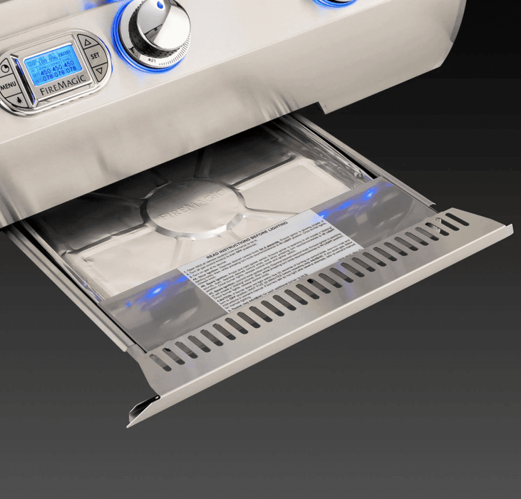 Additionally, Echelon Diamond grills come with a charcoal/smoker basket for adding a delicious, smoky flavor to your cook. For nighttime grilling, the interior of the grill is lit by two halogen lights. A new, larger drip tray with ball bearing glides makes cleanup with the disposable drip pan system even easier than before. Solid, raised hangers line the sides and back of the grill for a seamless look when placed into a countertop or island. A 120 VAC power source is required for ignition, as well as for the lighting functions. With all of these premium features, the Echelon Diamond series from Fire Magic defines luxury grilling.