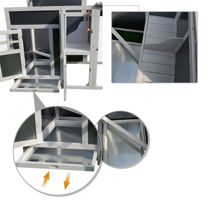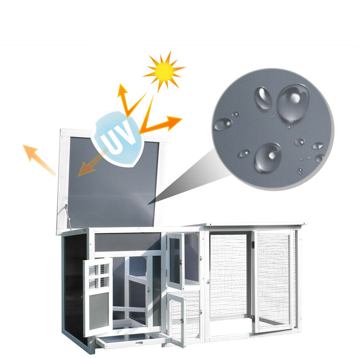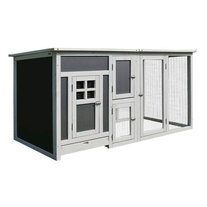 Moreover, the modern chicken coop is made from solid painted fir wood that keeps it sturdy and durable for a long time. The roof of the wooden chicken coop is hinged with polycarbonate panels for insulation.