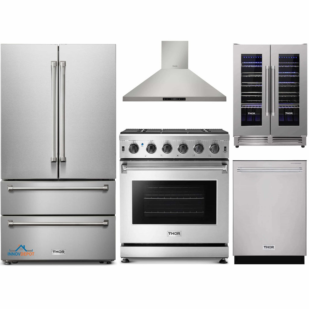 Thor Kitchen 5-Piece Appliance Package - 30-Inch Gas Range, French Door Refrigerator, Wall Mount Hood, Dishwasher, and Wine Cooler in Stainless Steel