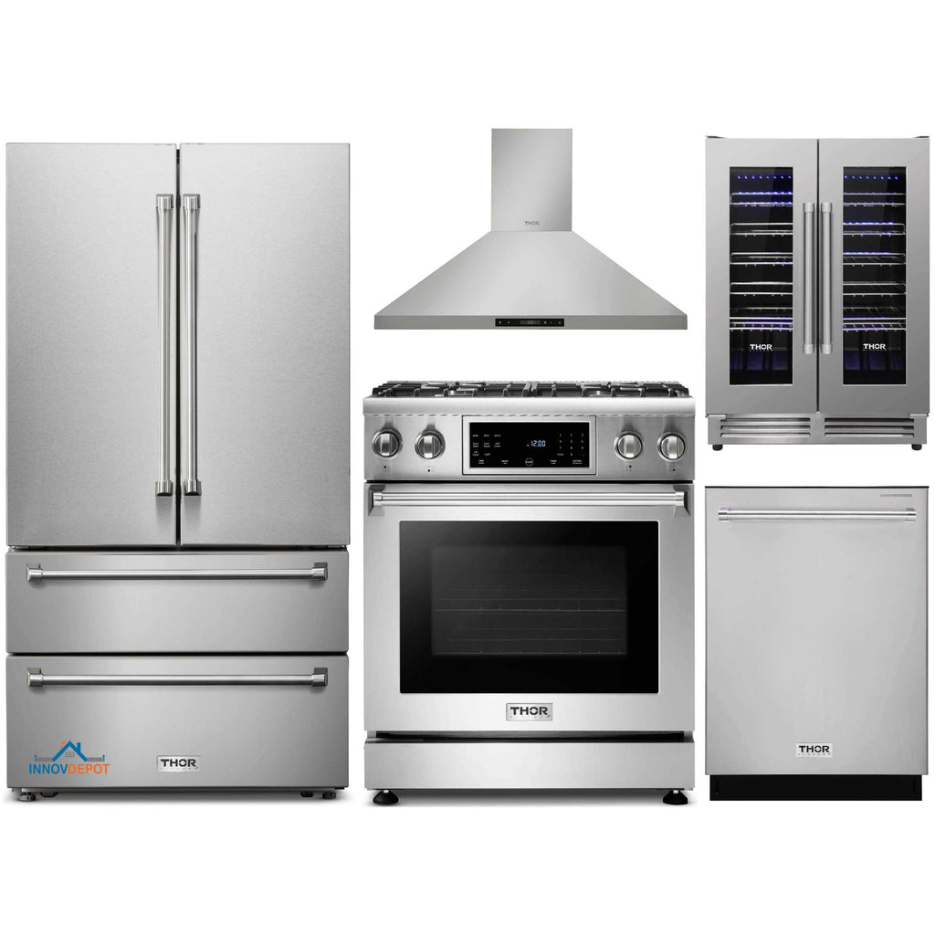 Thor Kitchen 5-Piece Appliance Package - 30-Inch Gas Range with Tilt Panel, French Door Refrigerator, Wall Mount Hood, Dishwasher, and Wine Cooler in Stainless Steel