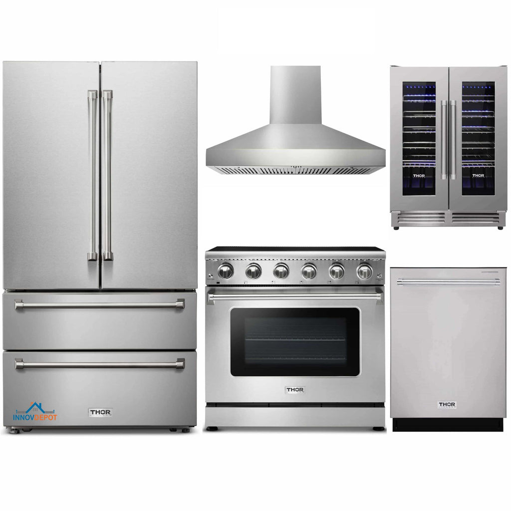 Thor Kitchen 5-Piece Appliance Package - 36-Inch Electric Range, French Door Refrigerator, Pro-Style Wall Mount Hood, Dishwasher, & Wine Cooler in Stainless Steel