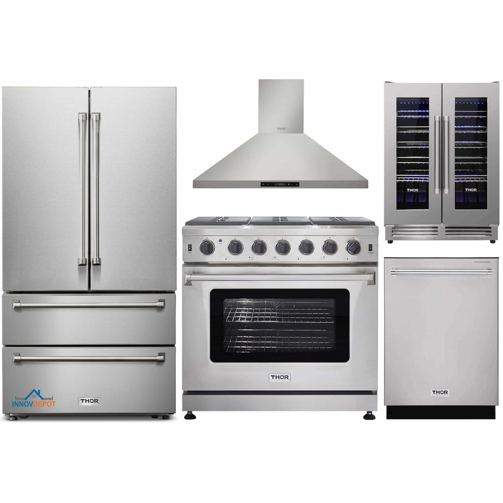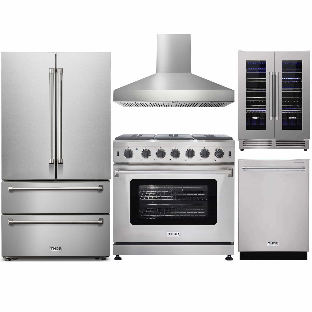 Thor Kitchen 5-Piece Appliance Package - 36-Inch Gas Range, French Door Refrigerator, Wall Mount Hood, Dishwasher, and Wine Cooler in Stainless Steel