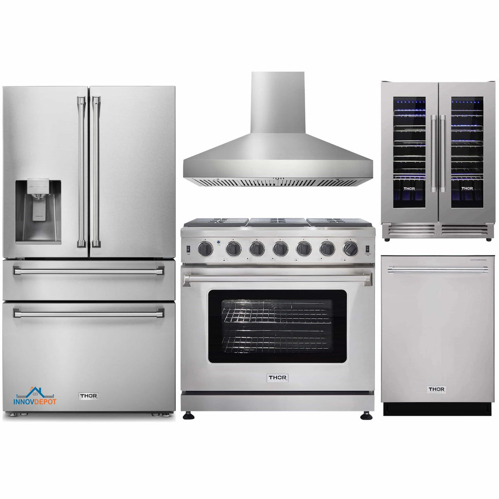 Thor Kitchen 5-Piece Appliance Package - 36-Inch Gas Range, Refrigerator with Water Dispenser, Pro-Style Wall Mount Hood, Dishwasher, & Wine Cooler in Stainless Steel