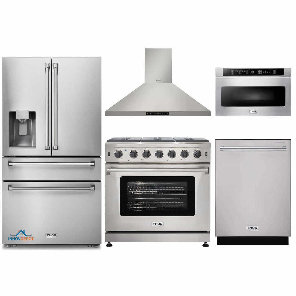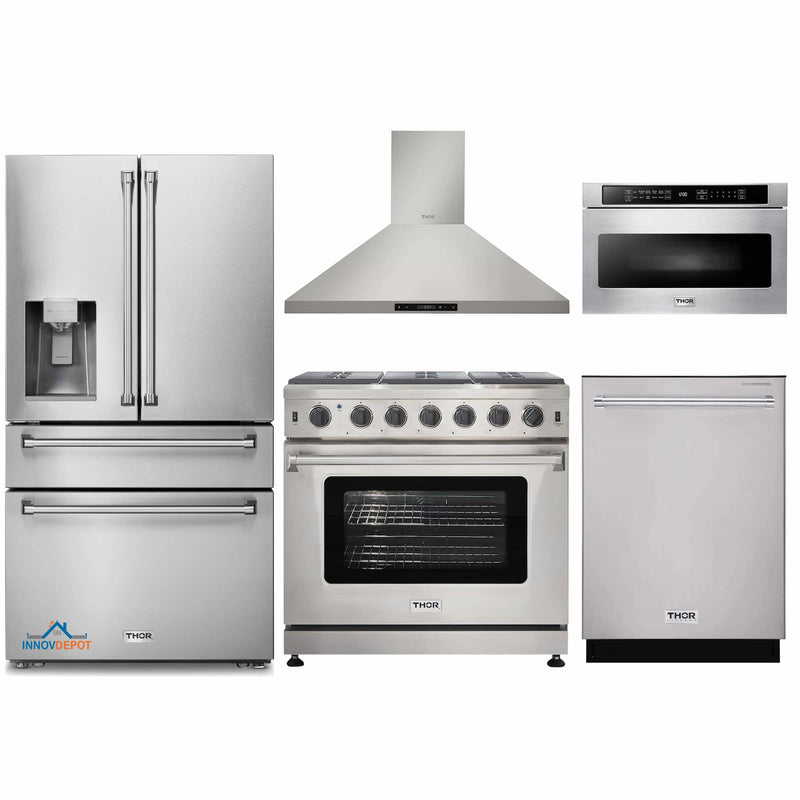 Thor Kitchen 5-Piece Appliance Package - 36-Inch Gas Range, Refrigerator with Water Dispenser, Wall Mount Hood, Dishwasher, & Microwave Drawer in Stainless Steel