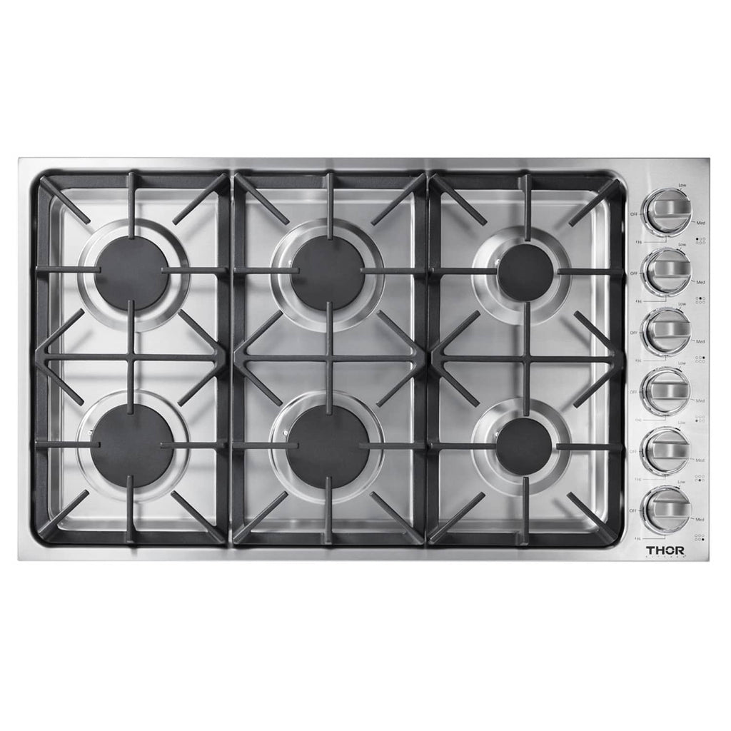Thor Kitchen 5-Piece Pro Appliance Package - 36-Inch Gas Cooktop, Electric Wall Oven, Wall Mount Hood, Dishwasher & Refrigerator with Water Dispenser in Stainless Steel