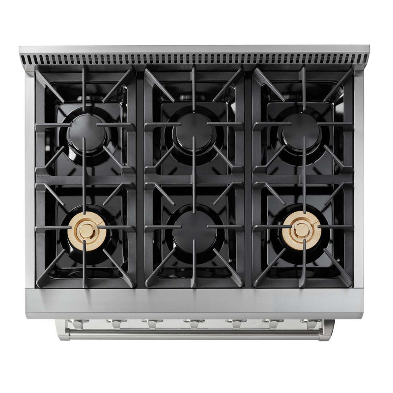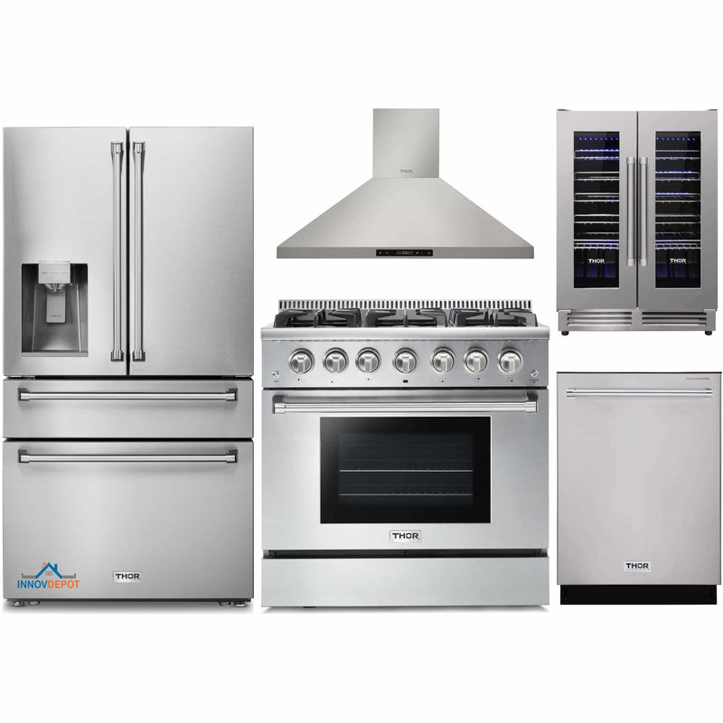 Thor Kitchen 5-Piece Pro Appliance Package - 36-Inch Gas Range, Refrigerator with Water Dispenser, Wall Mount Hood, Dishwasher, & Wine Cooler in Stainless Steel