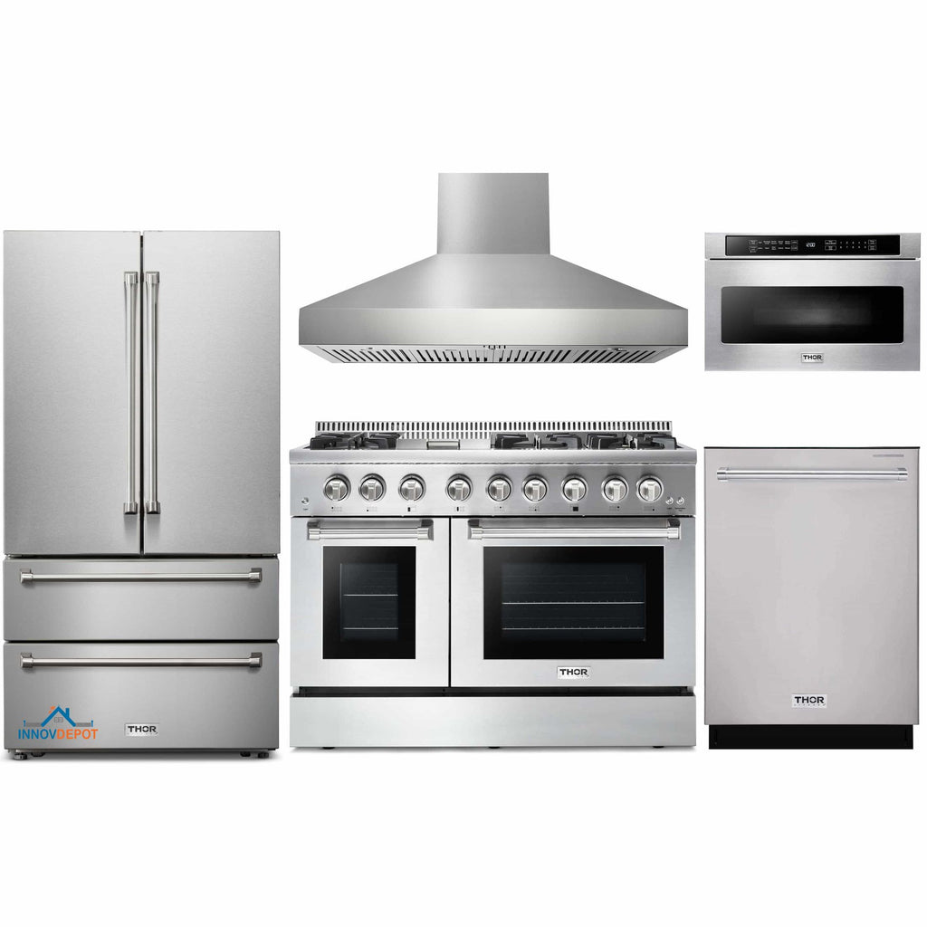Thor Kitchen 5-Piece Pro Appliance Package - 48-Inch Dual Fuel Range, French Door Refrigerator, Dishwasher, Pro Wall Mount Hood, and Microwave Drawer in Stainless Steel