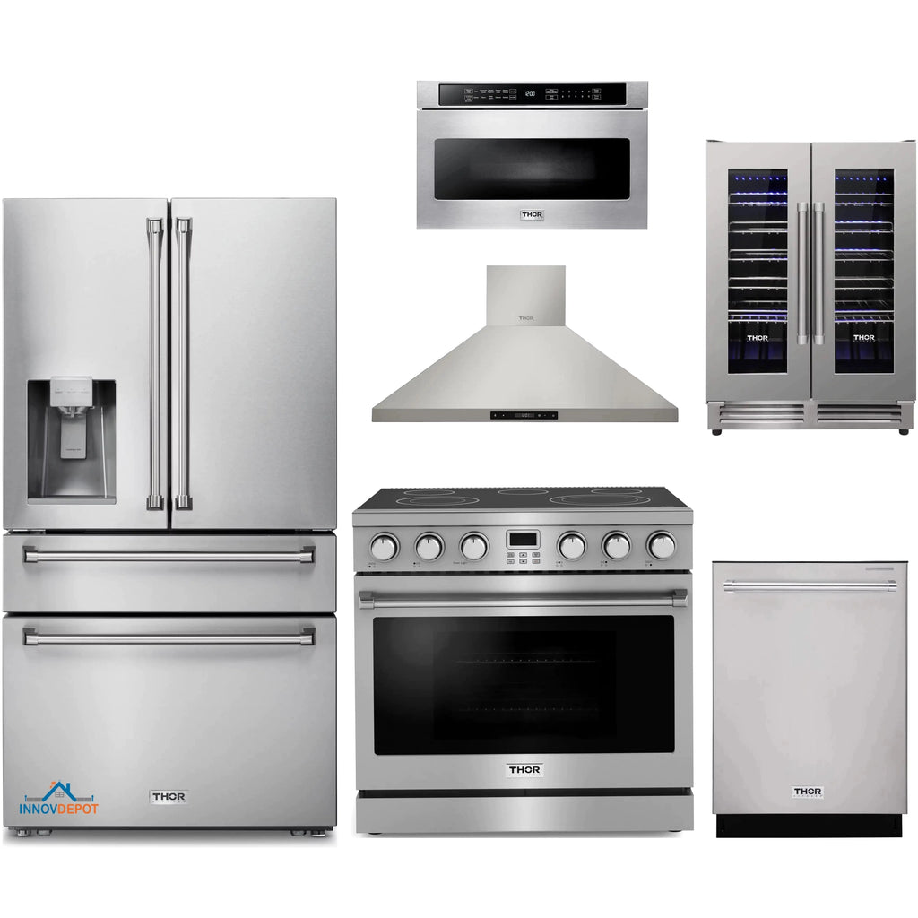 Thor Kitchen 6-Piece Appliance Package - 36-Inch Electric Range, Wall Mount Range Hood, Refrigerator with Water Dispenser, Dishwasher, Microwave, and Wine Cooler in Stainless Steel
