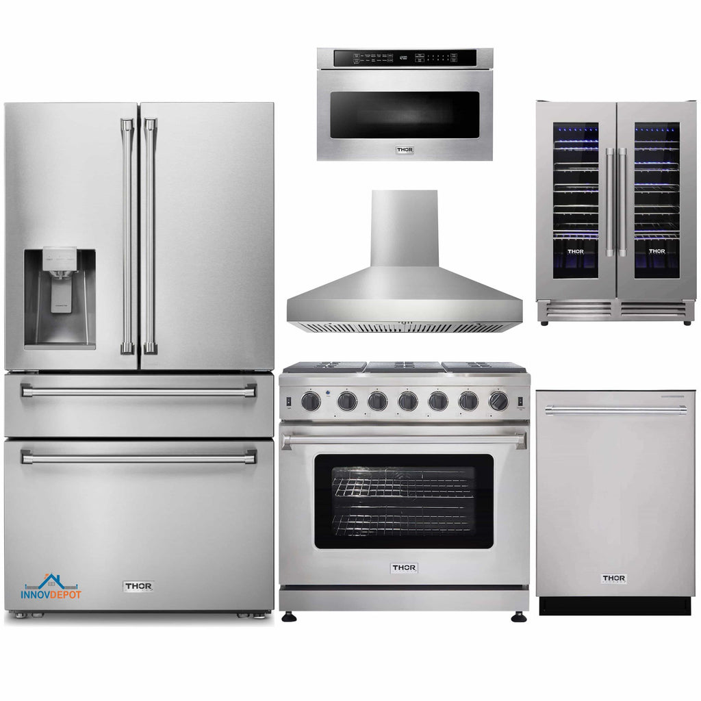 Thor Kitchen 6-Piece Appliance Package - 36-Inch Gas Range, Refrigerator with Water Dispenser, Pro-Style Wall Mount Hood, Dishwasher, Microwave Drawer, & Wine Cooler in Stainless Steel
