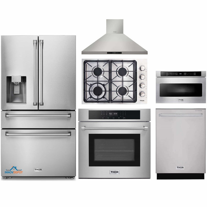 Thor Kitchen 6-Piece Pro Appliance Package - 30-Inch Gas Cooktop, Electric Wall Oven, Wall Mount Hood, Refrigerator with Water Dispenser, Dishwasher, & Microwave Drawer in Stainless Steel