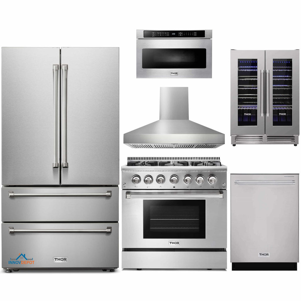 Thor Kitchen 6-Piece Pro Appliance Package - 36-Inch Dual Fuel Range, French Door Refrigerator, Pro-Style Wall Mount Hood, Dishwasher, Microwave Drawer, & Wine Cooler in Stainless Steel