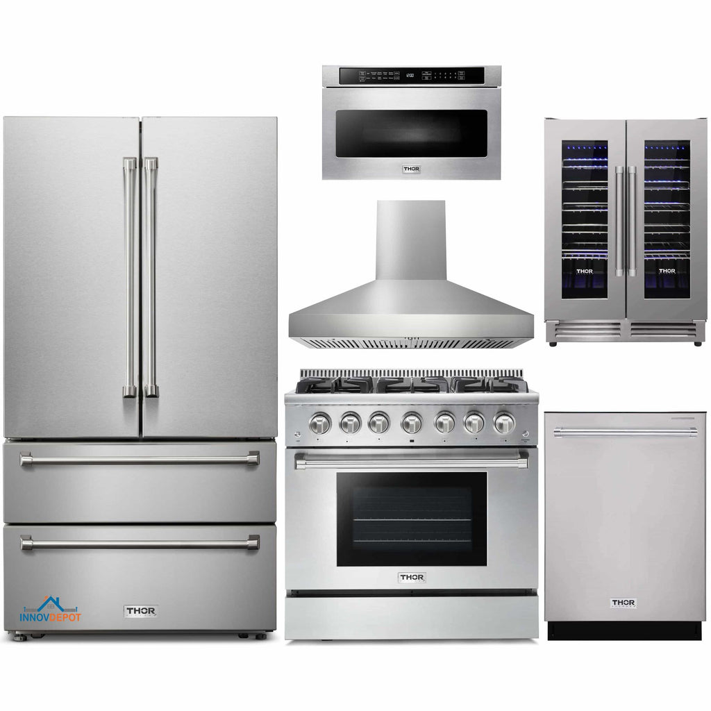 Thor Kitchen 6-Piece Pro Appliance Package - 36-Inch Gas Range, French Door Refrigerator, Pro-Style Wall Mount Hood, Dishwasher, Microwave Drawer, & Wine Cooler in Stainless Steel