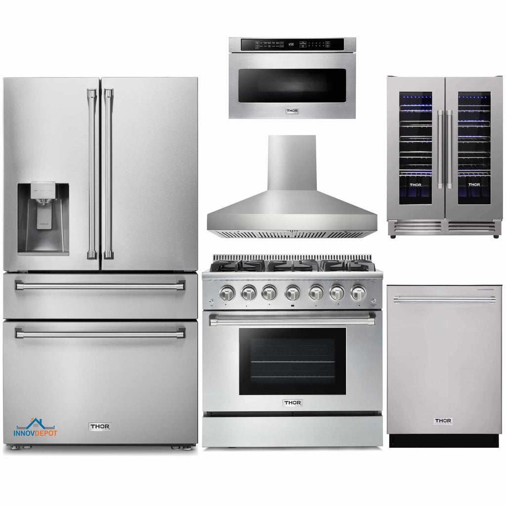 Thor Kitchen 6-Piece Pro Appliance Package - 36-Inch Gas Range, Refrigerator with Water Dispenser, Pro-Style Wall Mount Hood, Dishwasher, Microwave Drawer, & Wine Cooler in Stainless Steel