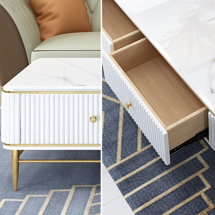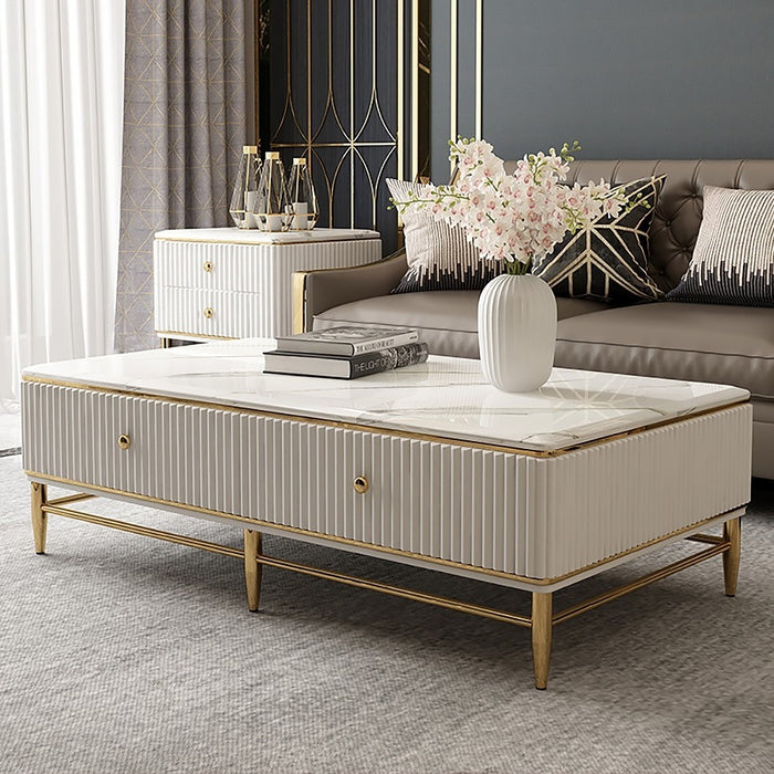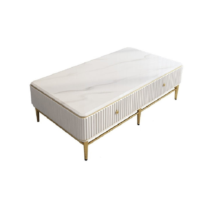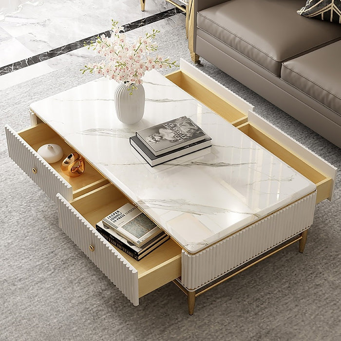 White Faux Marble Rectangle Coffee Table in Gold with 4 Storage Drawers